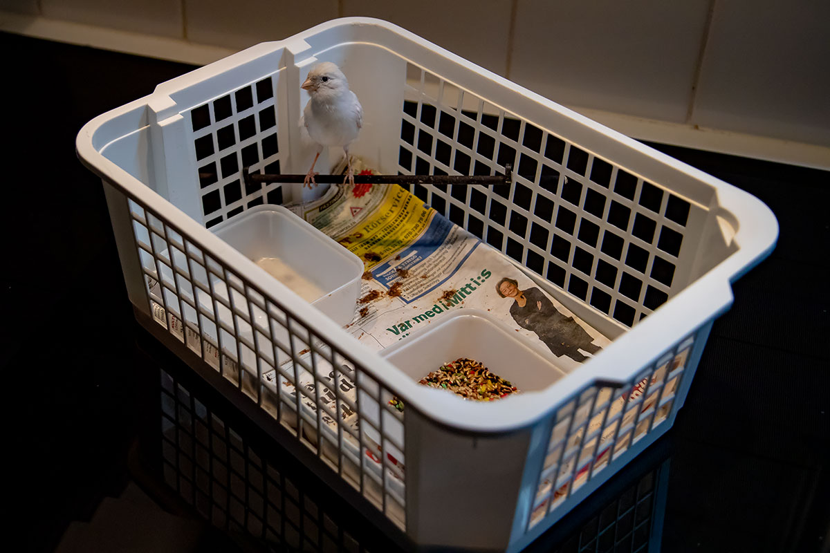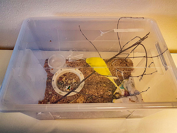En plastback med hål i så att fågeln får luft. Pinnar och skålar för vatten och mat.