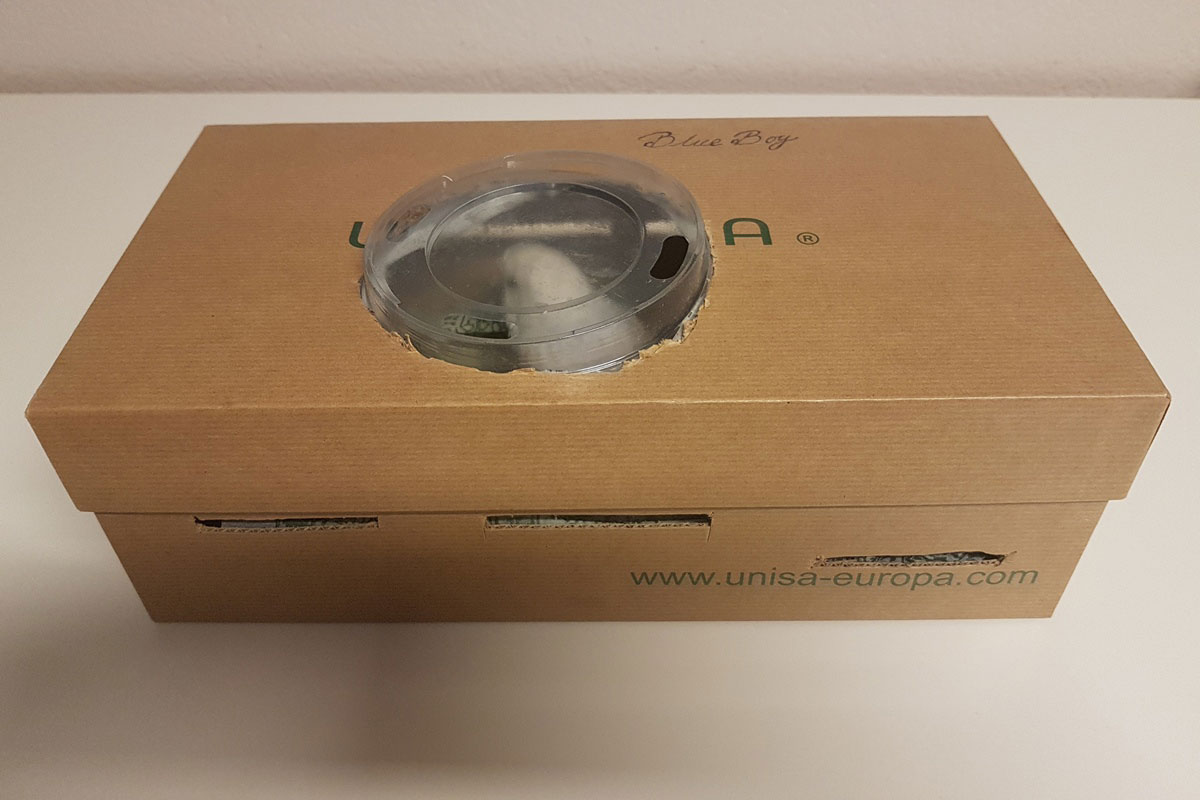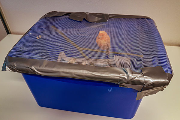 En plastback med ett myggnät eller liknande fasttejpat som lock.
