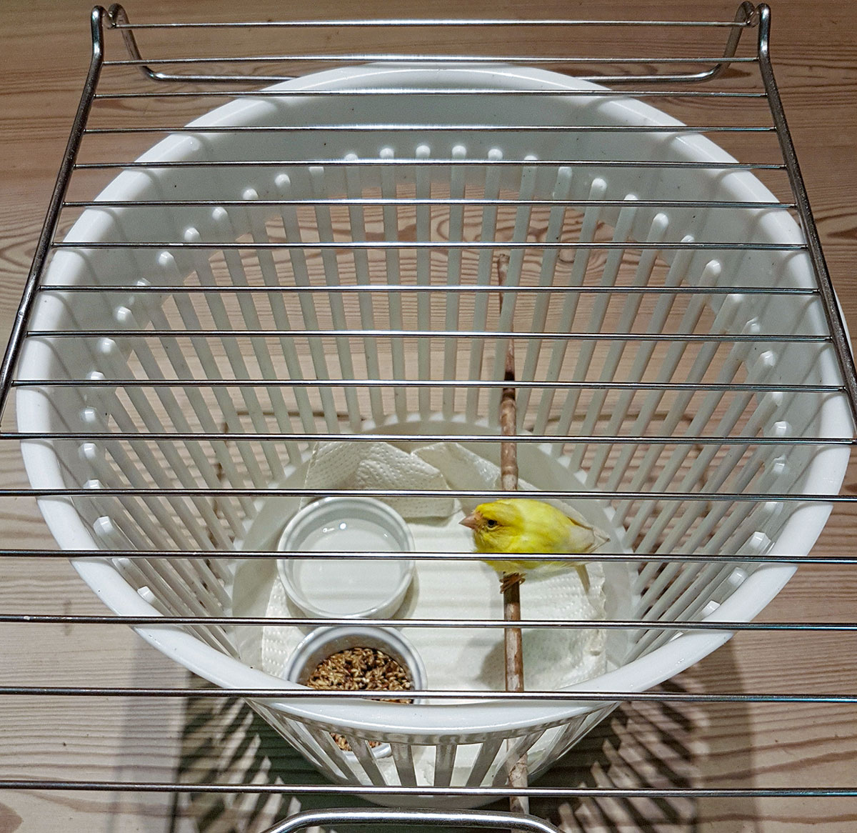 ![]() Till och med en pastakartong med fönster kan fungera. ![]() Kanske en papperskorg med ett grillgaller ovanpå finns att tillgå. Att förvara större papegojor i kartonger kan vara vanskligt då de lätt kan bita sönder en pappkartong. Har du inte någon bur, lås in fågeln i ett rum där den inte kan göra någon skada, till exempel bita sönder möbler och elledningar. Badrum eller toalett brukar fungera bra då det oftast inte finns några synliga elledningar där och då man inte brukar ha så mycket möbler där. Glöm inte att stänga toalettlocket om fågeln vistas där det finns en toalettstol.